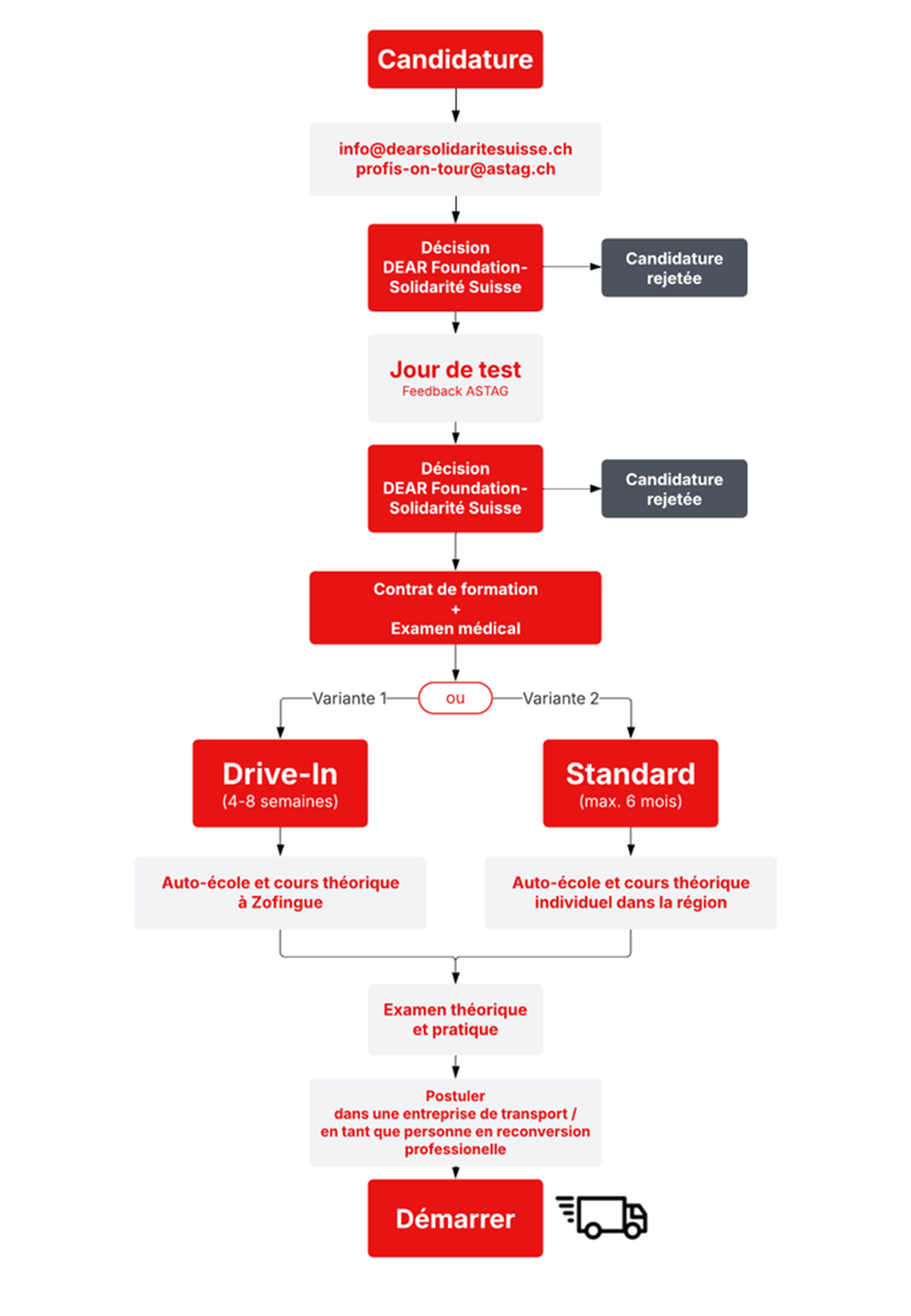 La fondation DEAR Foundation-Solidarité Suisse finance la formation des personnes intéressées qui ne peuvent pas se permettre de payer les frais de formation d'environ CHF 8'000 pour l'obtention du permis de conduire de la catégorie C. L'ASTAG fixe les conditions-cadres de la formation et soutient les participants à la formation dans la recherche d'écoles de conduite appropriées ainsi que, s'ils le souhaitent, dans la recherche d'un emploi après la réussite de l'examen.